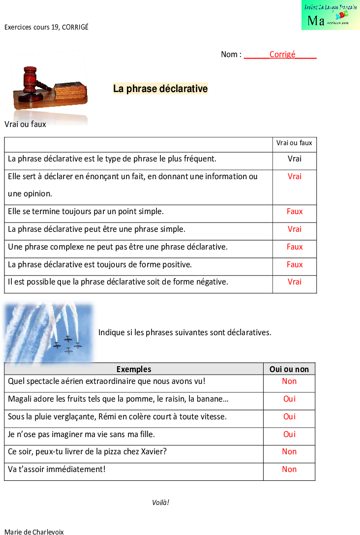 excercice corrigé La phrase déclarative