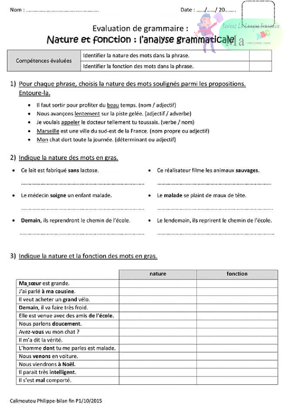 cours exercices la nature des mots dans une phrase les fonctions dans la phrase